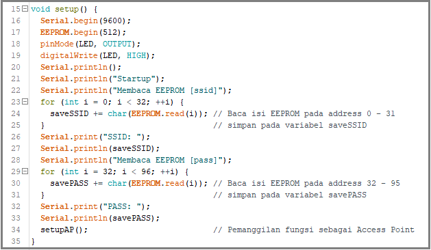 Program diatas merupakan perintah untuk pembacaan karakter pada memori wemos dengan perintah EEPROM.read() adapun data disimpan dimulai dari byte 0 sampai 31 untuk ssid dan 32 sampai 95 untuk password, kemudian setiap karakter yang dibaca dimasukkan ke variabel masing - masing, dapat dilihat pada screenshot dibawah ini merupakan respon serial monitor saat web server diakses dan simpan data ke eeprom.