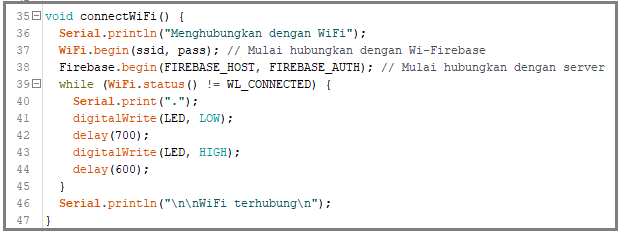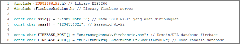 Program diatas digunakan untuk mengatur wemos sebagai client, library yang digunakan ESP8266WiFi untuk menghubungkan dengan jaringan Wi-Fi dan FirebaseArduino untuk menghubungkan dengan server firebase, agar dapat terhubung dengan jaringan Wi-Fi maka di atur terlebih dahulu nama dan password Wi-Fi yang ingin dihubungkan. Untuk menghubungkan ke database domain dan kode rahasia dari server firebase juga perlu diatur.