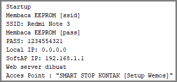 Untuk hasil dari percobaan ini dapat dilihat pada hasil screenshot serial monitor dibawah ini, dimana dengan membuat wemos sebagai Access Point dan membuat local web server dapat dilakukan pengaturan jaringan WiFi untuk terhubung dengan alat dengan cara menyimpan data pada eeprom.